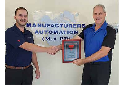 Presenting the award to Brent Raynor (right), Sales Manager at Manufacturers Automation Inc., is Brett Horst, Area Sales Manager for Carlo Gavazzi, pictured on the left.