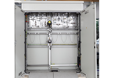 In total, two walk-in shelters and two large cabinets were built by Intertec to meet the custom shape, size and weight constraints. Each shelter houses an identical instrumentation system including pressure reduction sample conditioning equipment, a Danalyzer gas chromatograph, Rosemount pressure transmitters, calibration facilities and various safety devices and accessories. The two cabinets house cylinders to supply the required gas for calibration purposes, along with associated pressure regulation, measurement instruments, tubing connection and flow control components.