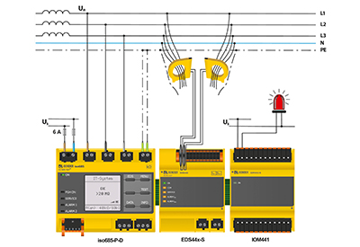 Up to 50 EDS can be connected to an iso685-D-P. By combining EDS44x with the IOM441 input/output module, a potential-free contact can be made available for each EDS44x measurement channel. This enables messages to be generated or outputs with unimportant loads to be disconnected so that the IT system can maintain high availability for important loads.